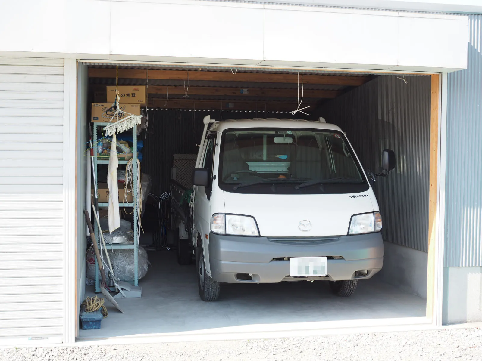 1tトラックまでガレージに駐車可能で、ちょっとした備品も設置できます。